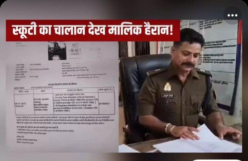 मुज़फ्फरनगर (उत्तर प्रदेश): सोशल मीडिया पर इन दिनों एक चालान की फोटो वायरल हो रही है, जिसमें एक स्कूटर पर ₹20.74 लाख का चालान काटा गया था। इस फोटो को देखकर लोग हैरान रह गए। मामला तूल पकड़ते ही पुलिस हरकत में आई। जांच के बाद पता चला कि यह इंस्पेक्टर की टाइपिंग मिस्टेक थी।